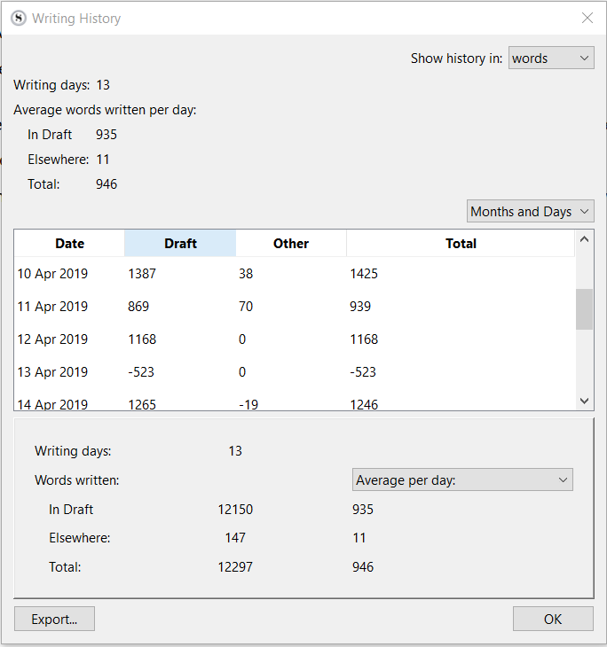 Scrivener, my primary writing tool, has a daily word count feature that shows how I’m doing word-wise. I both love and hate it (the feature, not Scrivener). Here’s a screenshot of my past few days.